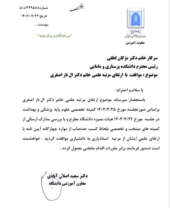 بدین وسیله ارتقای مرتبه علمی سرکار خانم دکتر الناز اصغری، عضو هیات علمی گروه پرستاری داخلی جراحی از مرتبه استادیاری به دانشیاری را خدمت ایشان، خانواده محترم و کلیه همکاران دانشکده تبریک و تهنیت عرض نموده، توفیق روز افزونشان را از درگاه خداوند منان خواستاریم.