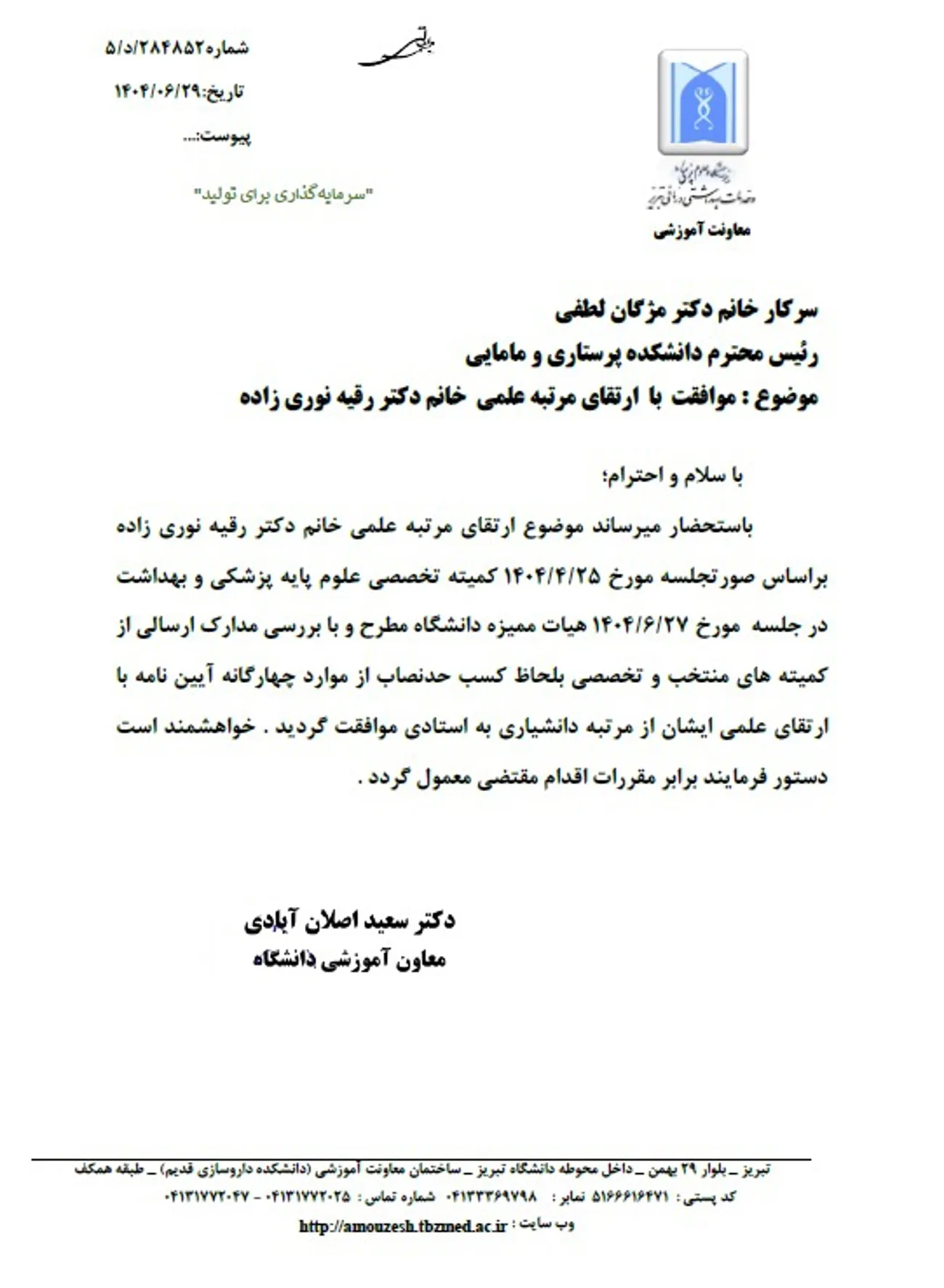 بدین وسیله ارتقای مرتبه علمی سرکار خانم دکتر رقیه نوری زاده، عضو محترم هیات علمی گروه مامایی از مرتبه علمی دانشیاری به استادی را خدمت ایشان، خانواده محترم و کلیه همکاران دانشکده تبریک و تهنیت عرض نموده، توفیق روز افزونشان را از درگاه خداوند منان خواستاریم.