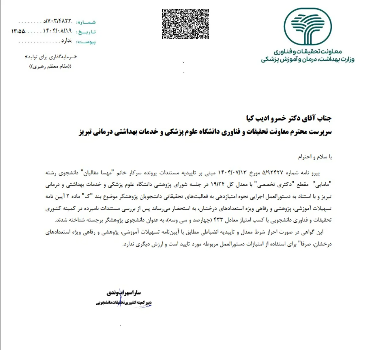 پیرو نامه شماره 4822/ 703 / د مورخه404/8/19 معاونت محترم تحقیقات و فناوری وزارت بهداشت درمان و آموزش پزشکی، سرکار خانم مهسا مقالیان دانشجوی رشته مامایی با مقطع دکترای تخصصی به عنوان دانشجوی پژوهشگر برجسته شناخته شدند. این افتخار را خدمت ایشان و خانواده بزرگ دانشکده پرستاری و مامایی تبریک عرض می کنیم.
