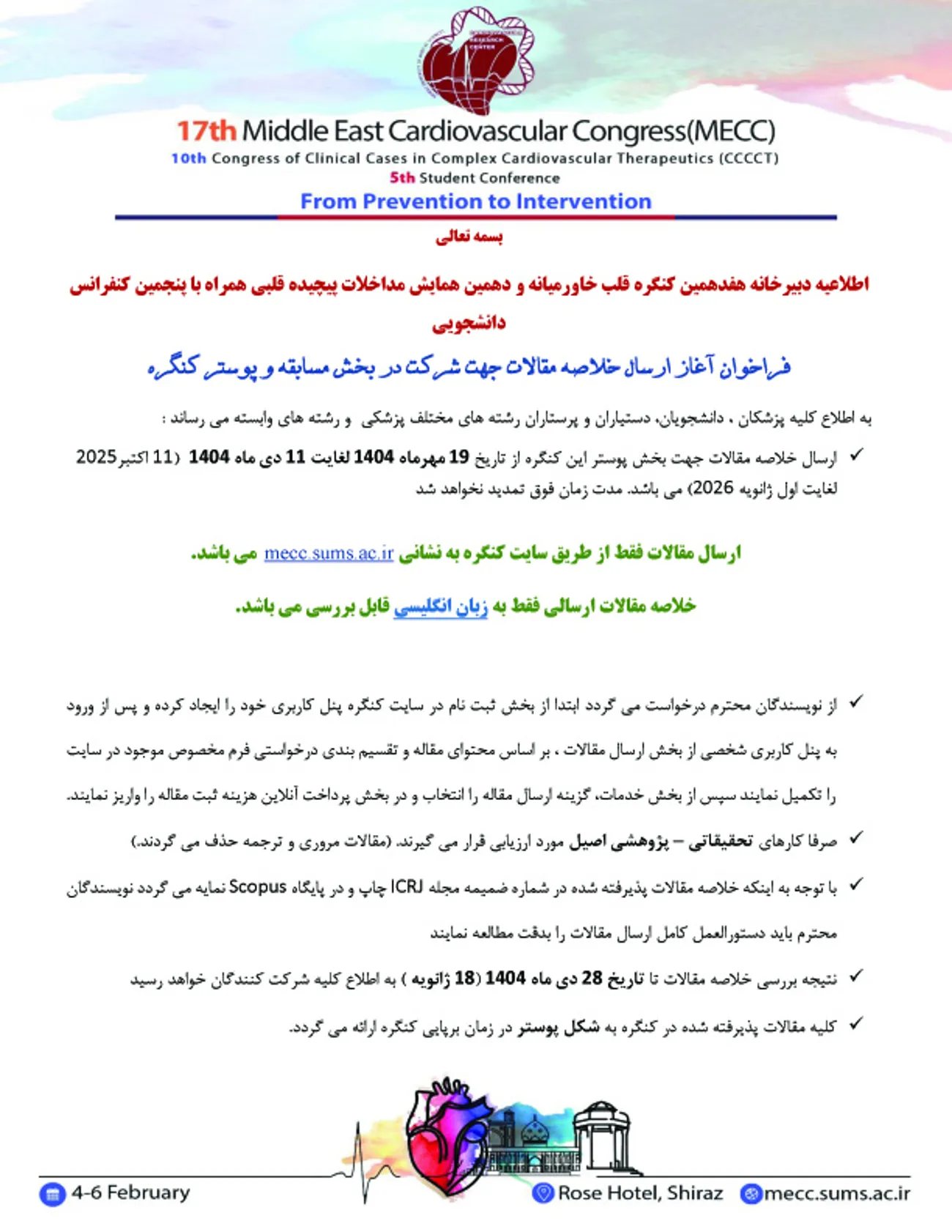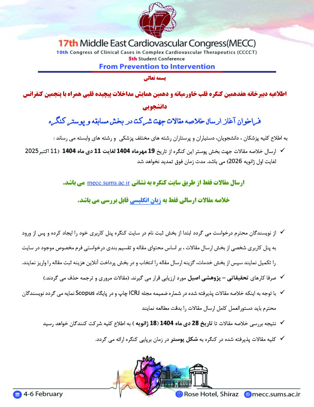 هفدهمین کنگره بین المللی قلب خاورمیانه و دهمین همایش مداخلات پیچیده قلبی همراه با پنجمین کنفرانس دانشجویی 15 لغایت 17 بهمن ماه سال جاری برابر با 4 لغایت 6 فوریه سال 2026 در شهر صدرای شیراز ( هتل بین المللی رز) برگزار خواهد گردید.