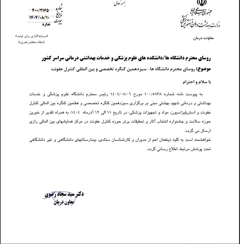 دانشگاه علوم پزشکی و خدمات بهداشتی درمانی شهید بهشتی در تاریخ 11 تا 12 آذر ماه سال جاری سیزدهمین کنگره تخصصی و هفتمین کنگره بین المللی کنترل عفونت و استریلیزاسیون مواد و تجهیزات پزشکی را برگزار می کند.