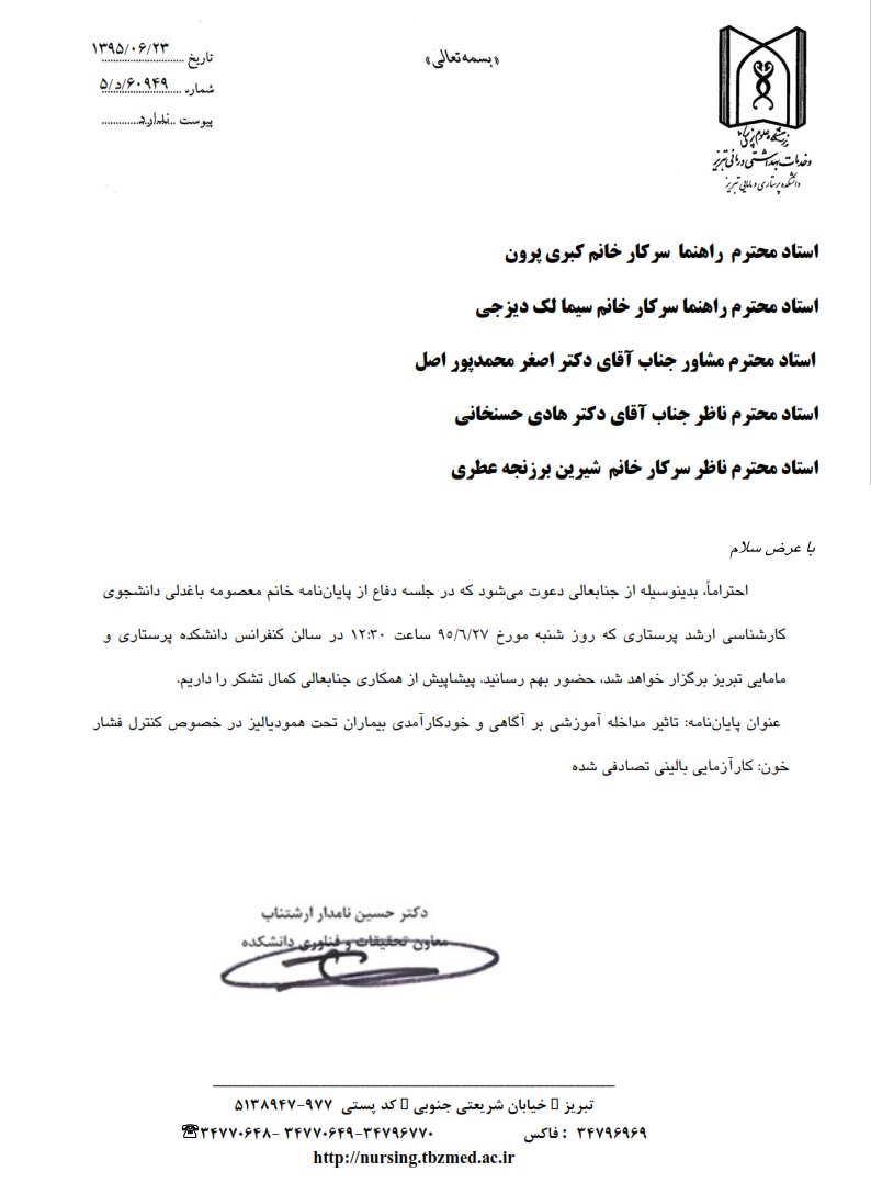 جلسه دفاع از پایاننامه خانم معصومه باغدلی، دانشجوی کارشناسی ارشد پرستاری