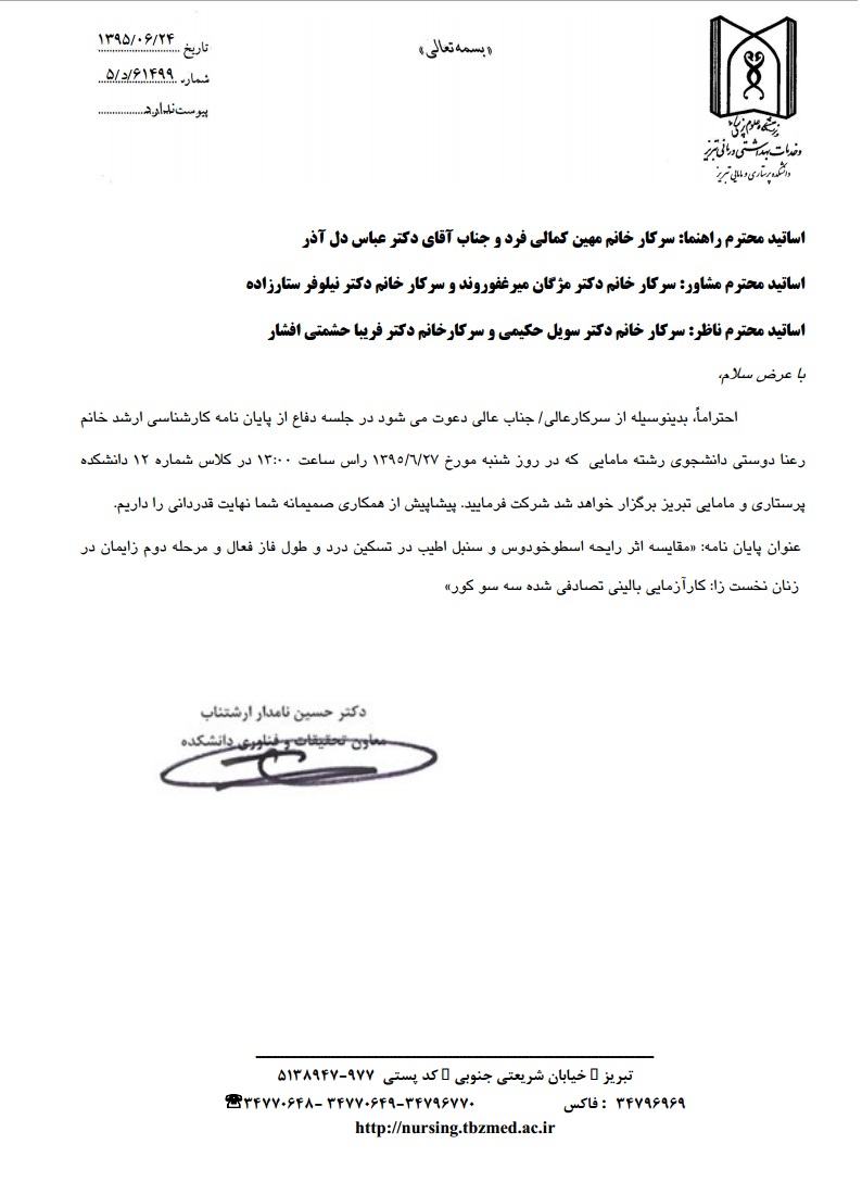 جلسه دفاع از پایاننامه خانم رعنا دوستی، دانشجوی کارشناسی ارشد مامایی