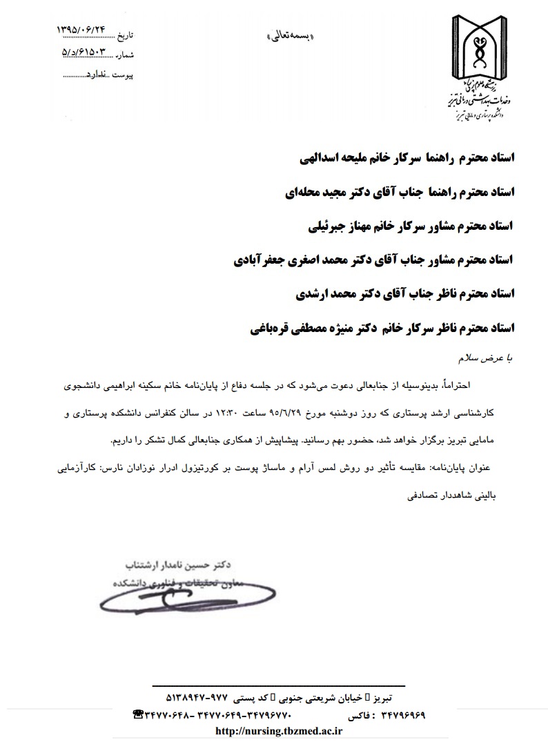 جلسه دفاع از پایاننامه خانم سکینه ابراهیمی، دانشجوی کارشناسی ارشد پرستاری