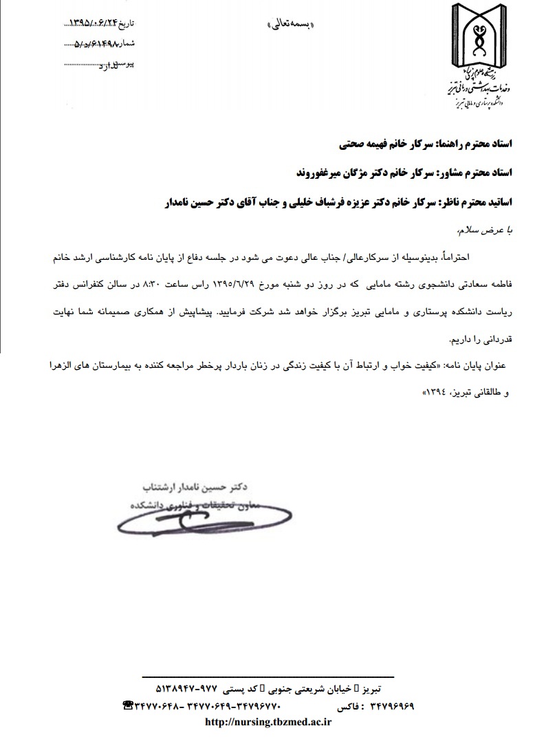 جلسه دفاع از پایاننامه خانم فاطمه سعادتی، دانشجوی کارشناسی ارشد مامایی