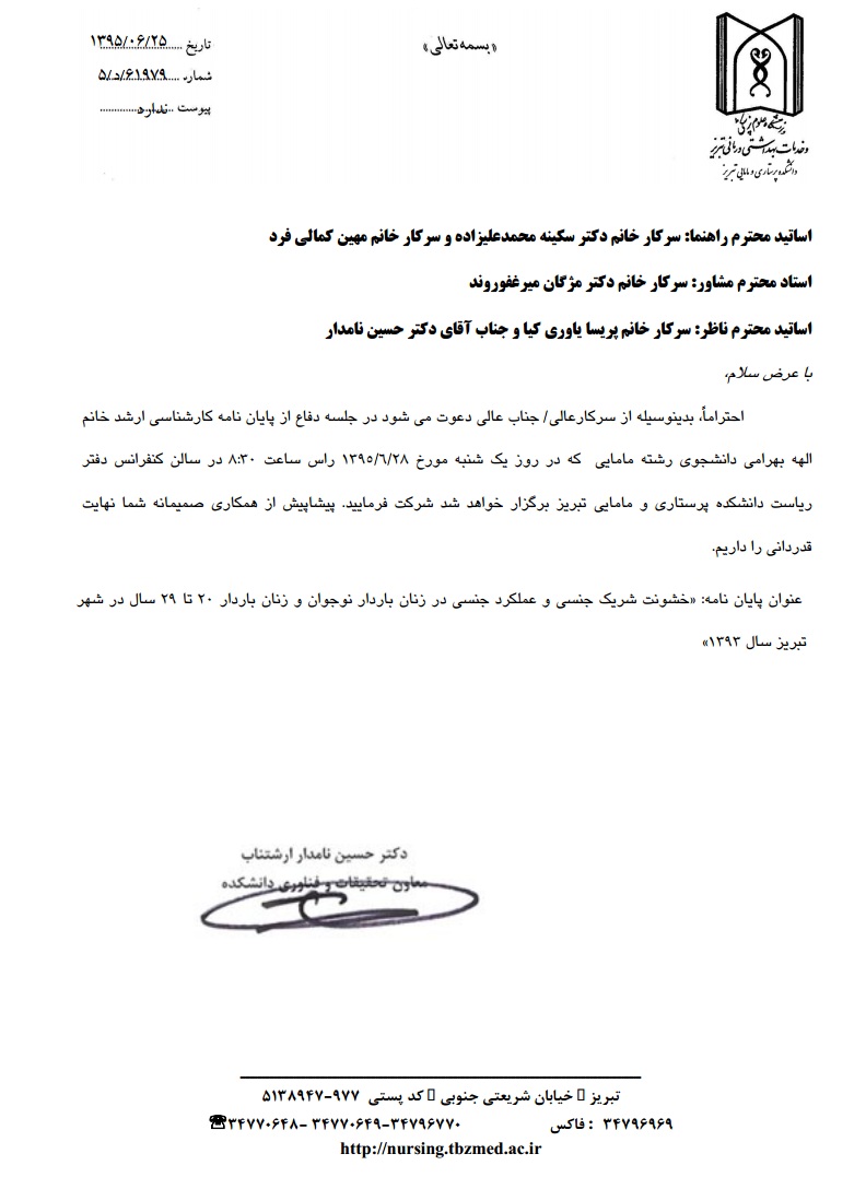 جلسه دفاع از پایاننامه خانم الهه بهرامی، دانشجوی کارشناسی ارشد مامایی