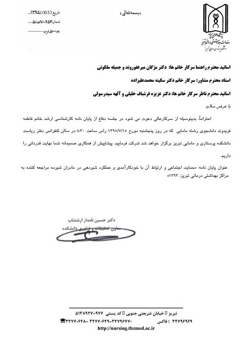 جلسه دفاع از پایاننامه خانم فاطمه فریدوند، دانشجوی کارشناسی ارشد مامایی