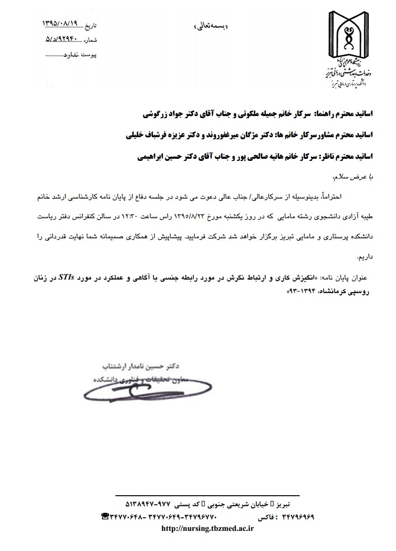 جلسه دفاع از پایاننامه خانم طیبه آزادی، دانشجوی کارشناسی ارشد مامایی