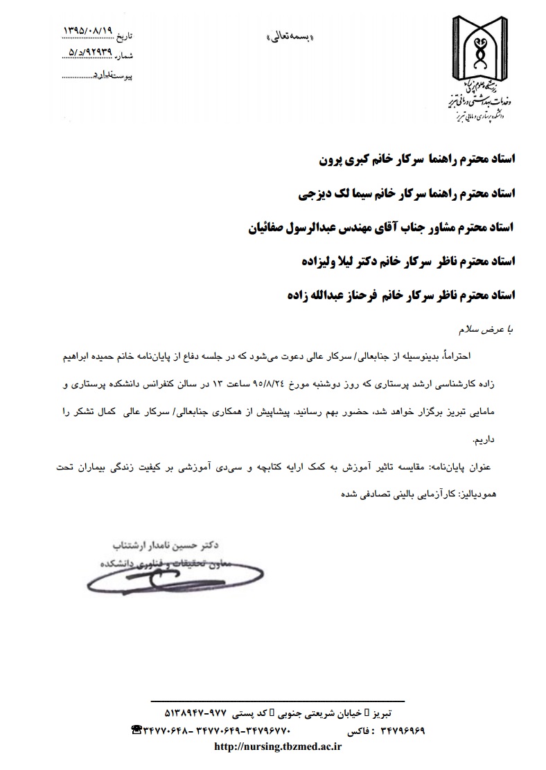 جلسه دفاع از پایاننامه خانم حمیده ابراهیم زاده، دانشجوی کارشناسی ارشد پرستاری