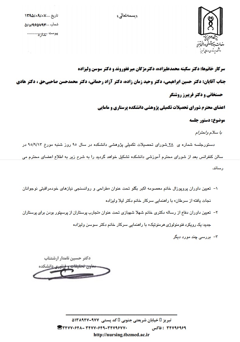 دستور جلسه بیست و هشتم شورای تحصیلات تکمیلی پژوهشی دانشکده در سال 95؛ روز شنبه مورخه 13 آذر