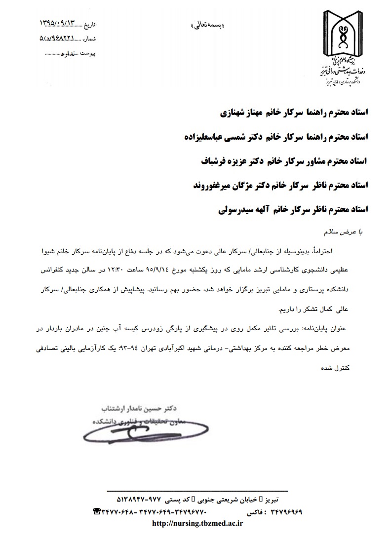 جلسه دفاع از پایاننامه خانم شیوا عظیمی، دانشجوی کارشناسی ارشد مامایی