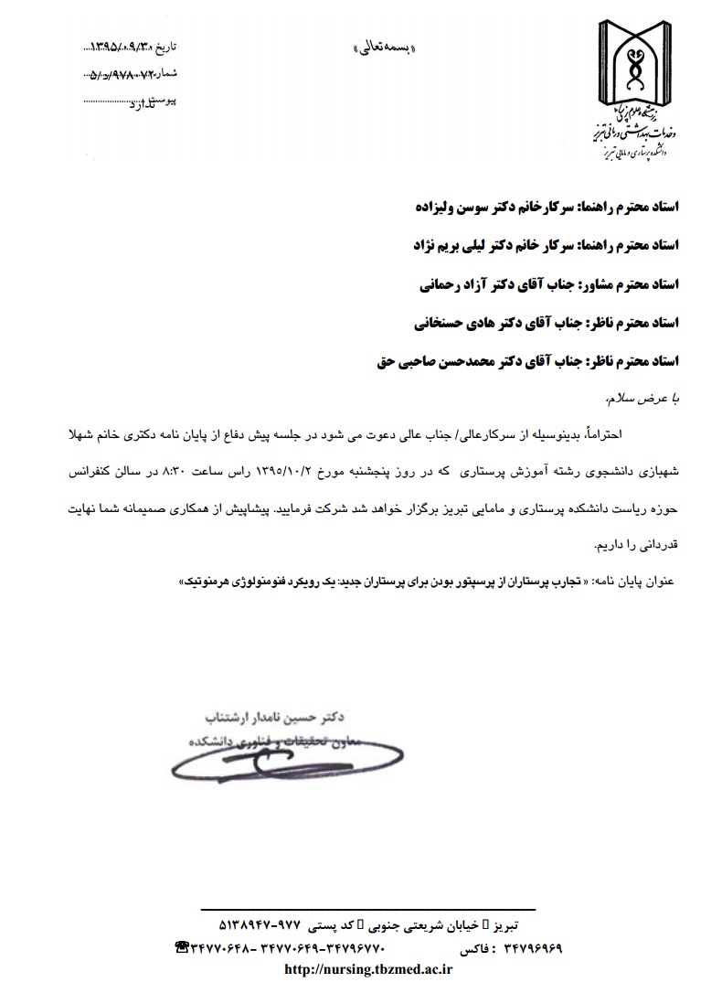 جلسه پیش دفاع رساله دکترای سرکار خانم شهلا شهبازی تحت عنوان "تجارب پرستاران از پرسپتور بودن برای پرستاران جدید: یک رویکرد فنومنولوژی هرمنوتیک"