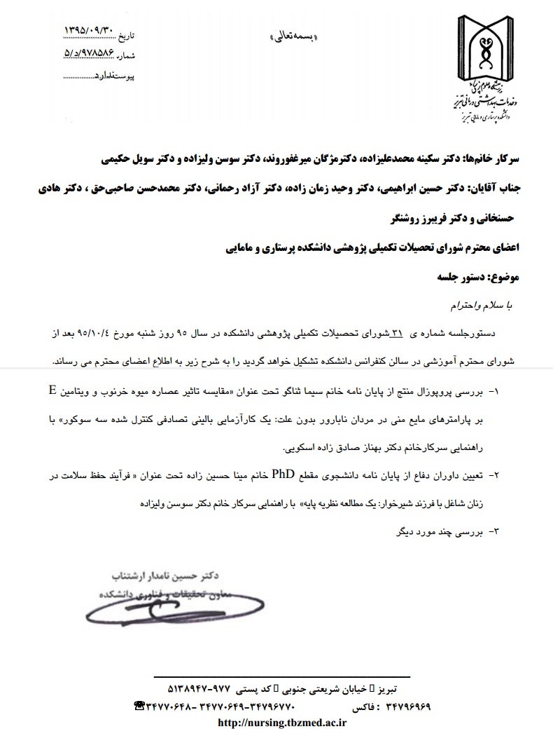 دستور جلسه سی و یکم شورای تحصیلات تکمیلی پژوهشی دانشکده در سال 95؛ روز شنبه مورخه 4 دی