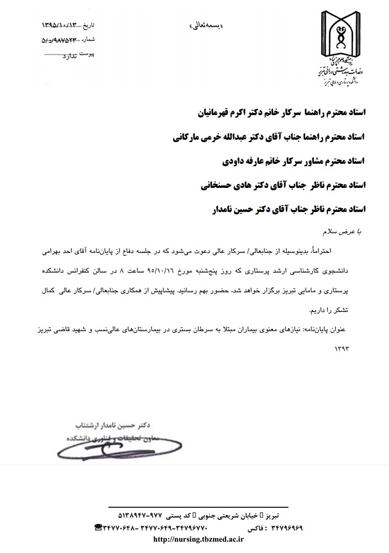 جلسه دفاع از پایاننامه آقای احد بهرامی، دانشجوی کارشناسی ارشد پرستاری