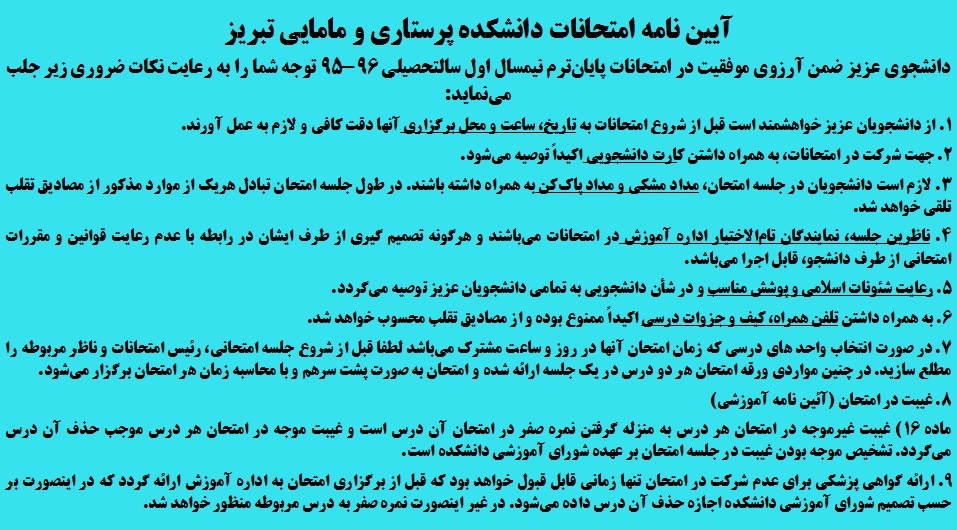امتحانات پایان ترم نیمسال اول سال تحصیلی 96-95 دانشجویان در رشته های پرستاری، مامایی و اتاق عمل در سه مقطع کارشناسی، کارشناسی ارشد و دکتری از صبح امروز شنبه 18 دیماه در دانشکده آغاز و مقرر است این آزمون ها تا تاریخ 3 بهمن ماه ادامه داشته باشد. مقررات آزمون های پایان ترم دانشکده را در زیر مشاهده می نمائید.
