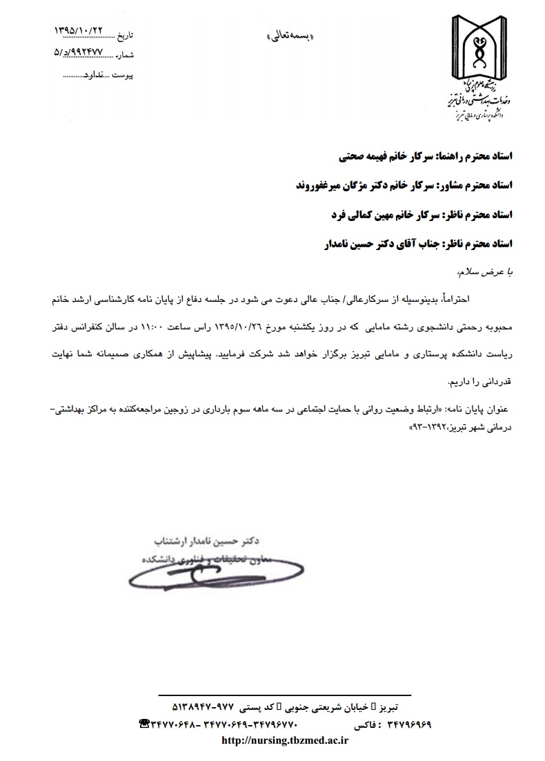 جلسه دفاع از پایاننامه خانم محبوبه رحمتی، دانشجوی کارشناسی ارشد مامایی