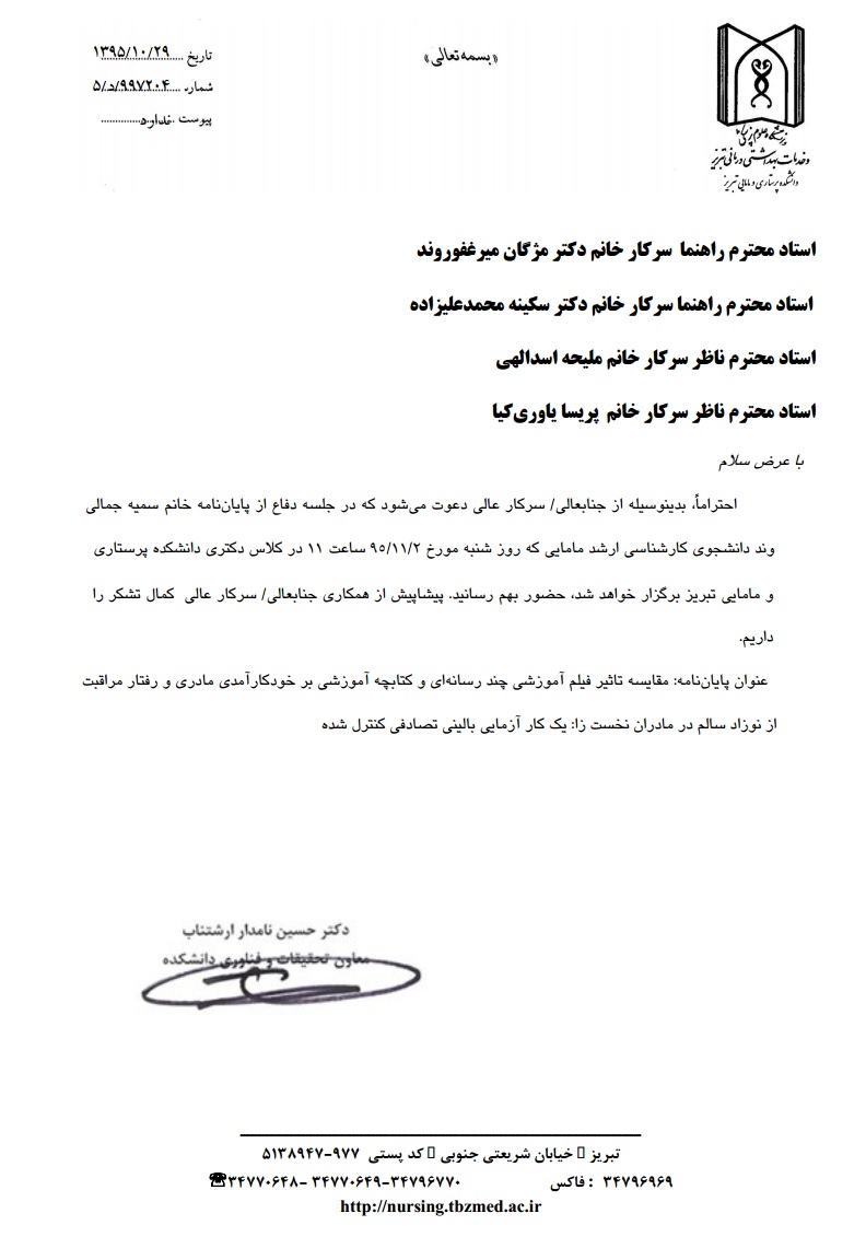 جلسه دفاع از پایاننامه خانم سمیه جمالی وند، دانشجوی کارشناسی ارشد مامایی