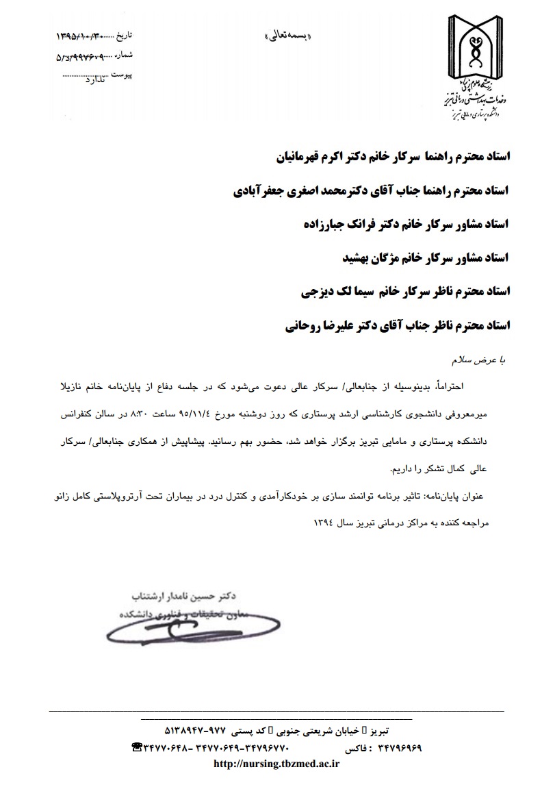 جلسه دفاع از پایاننامه خانم نازیلا میرمعروفی، دانشجوی کارشناسی ارشد پرستاری
