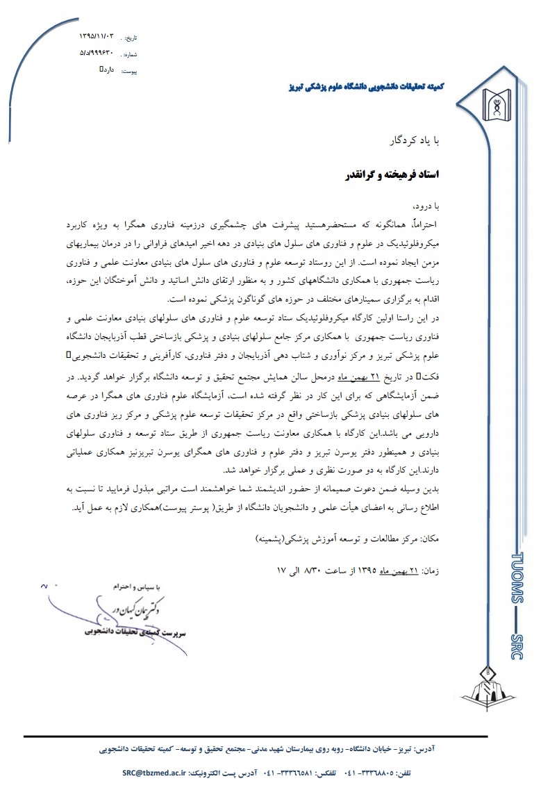 اولین کارگاه میکروفیوئیدیک ستاد توسعه علوم و فناوری های سلول های بنیادی معاونت علمی و فناوری ریاست جمهوری با همکاری مرکز جامع سلولهای بنیادی و پزشکی در تاریخ 21 بهمن ماه در ...