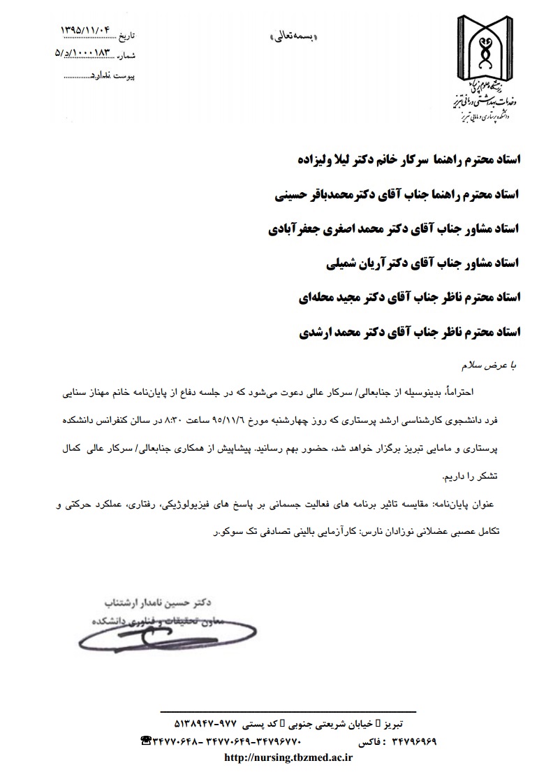 جلسه دفاع از پایاننامه خانم مهناز سنایی فرد، دانشجوی کارشناسی ارشد پرستاری