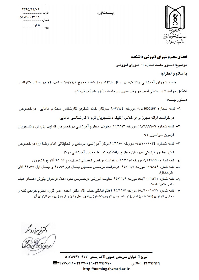 دستور جلسه سی و یکمین شورای آموزشی در سال 95؛ روز شنبه مورخه 9 بهمن