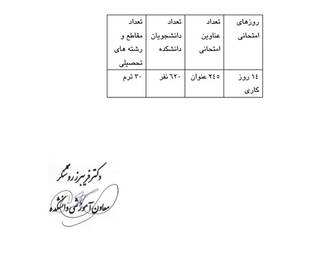 بر اساس اعلام معاون آموزشی دانشکده، گزارش امتحانات نهایی نیمسال اول سال تحصیلی 96-95 دانشکده به شرح زیر می باشد.