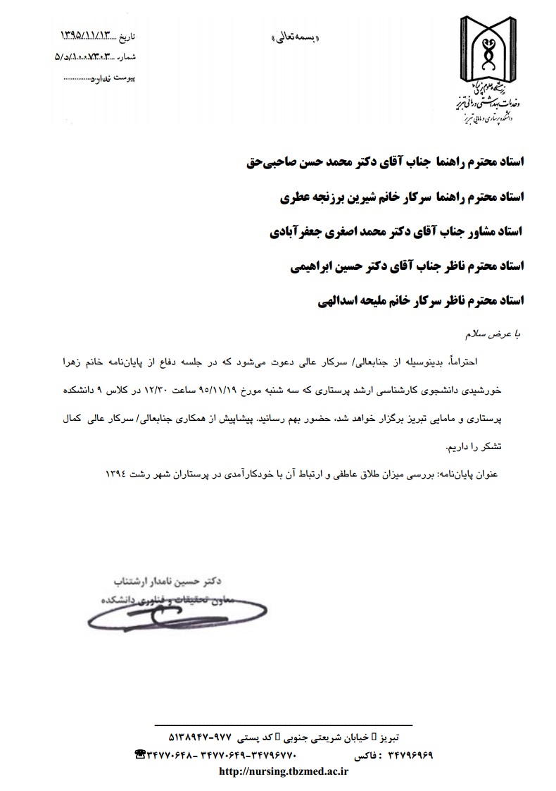 جلسه دفاع از پایاننامه خانم زهرا خورشیدی، دانشجوی کارشناسی ارشد پرستاری