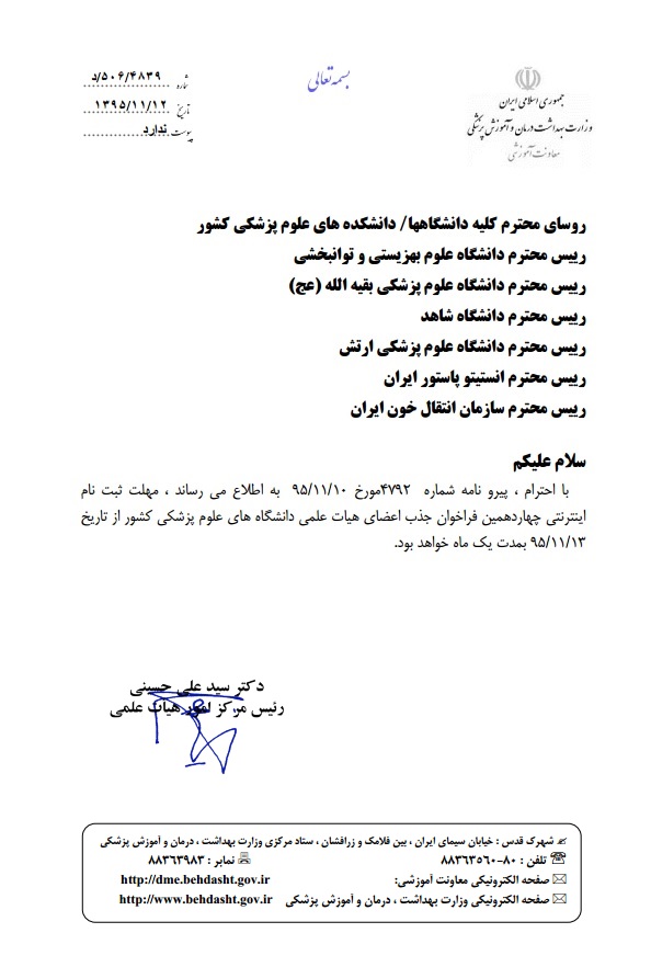 رئیس مرکز امور هیأت علمی وزارت بهداشت اعلام کرد مهلت ثبت نام اینترنتی چهاردهمین فراخوان جذب اعضای هیأت علمی دانشگاه های علوم پزشکی کشور از تاریخ 13 بهمن بمدت ...