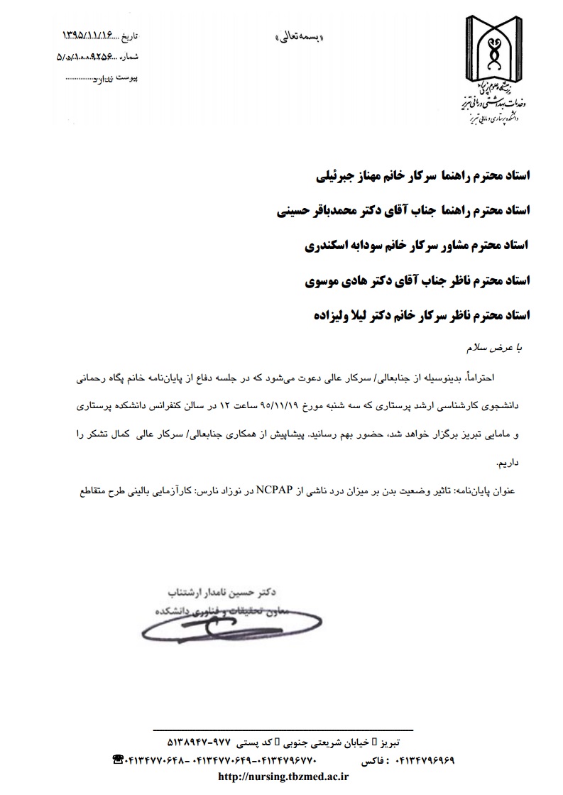 جلسه دفاع از پایاننامه خانم پگاه رحمانی، دانشجوی کارشناسی ارشد پرستاری