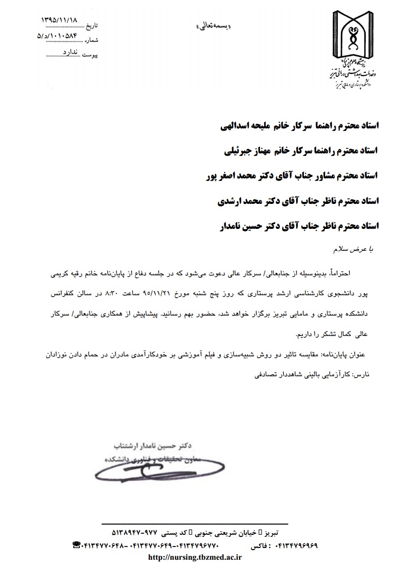 جلسه دفاع از پایاننامه خانم رقیه کریمی پور، دانشجوی کارشناسی ارشد پرستاری