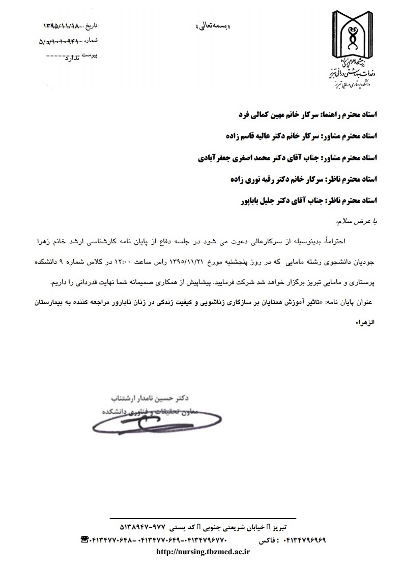 جلسه دفاع از پایاننامه خانم زهرا جودیان، دانشجوی کارشناسی ارشد مامایی