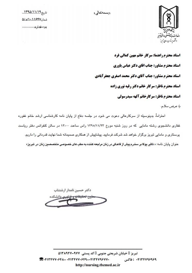 جلسه دفاع از پایاننامه خانم غفوره غفاری، دانشجوی کارشناسی ارشد مامایی