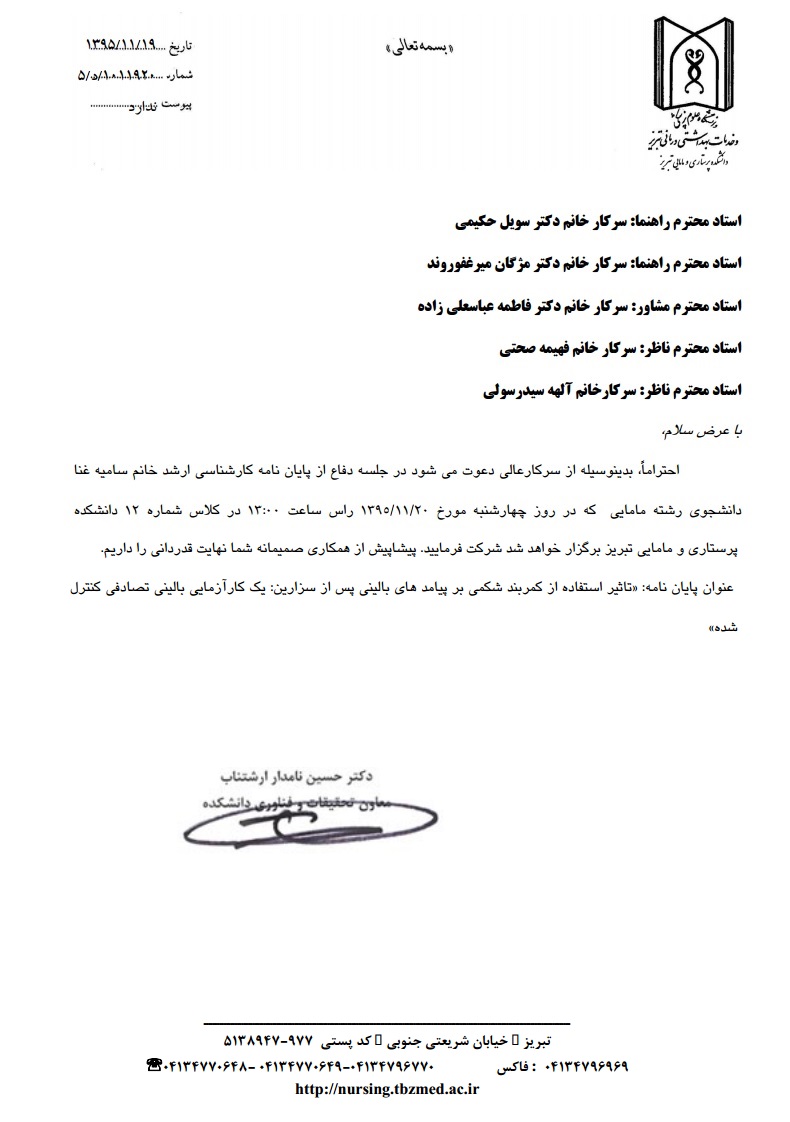 جلسه دفاع از پایاننامه خانم سامیه غنا، دانشجوی کارشناسی ارشد مامایی