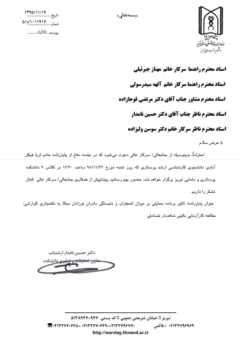 جلسه دفاع از پایاننامه خانم ثریا هیکل آبادی، دانشجوی کارشناسی ارشد پرستاری