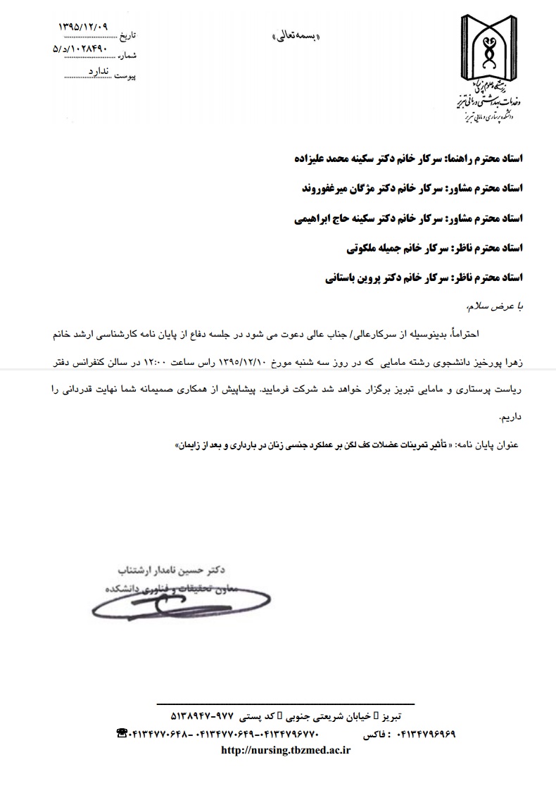 جلسه دفاع از پایاننامه خانم زهرا پورخیز، دانشجوی کارشناسی ارشد مامایی