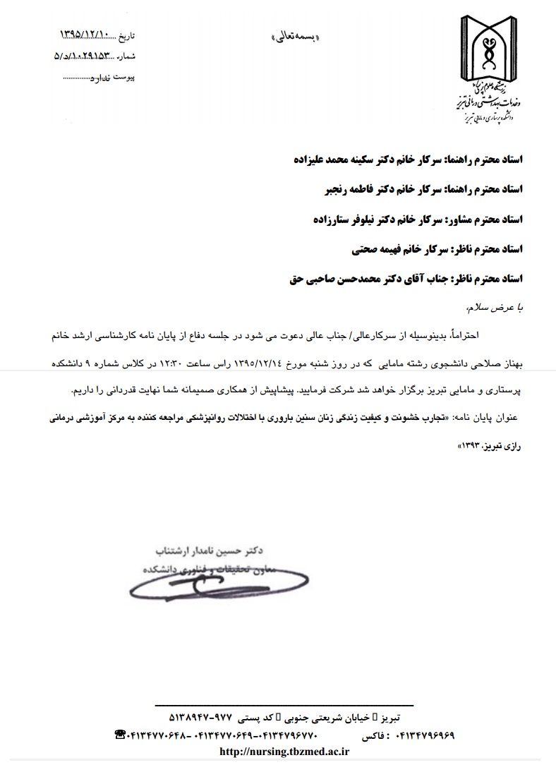 جلسه دفاع از پایاننامه خانم بهناز صلاحی، دانشجوی کارشناسی ارشد مامایی