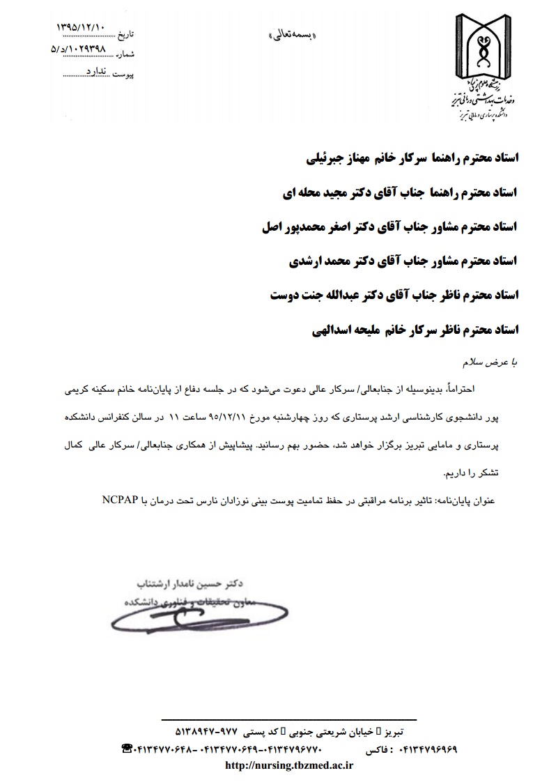 جلسه دفاع از پایاننامه خانم سکینه کریمی پور، دانشجوی کارشناسی ارشد پرستاری