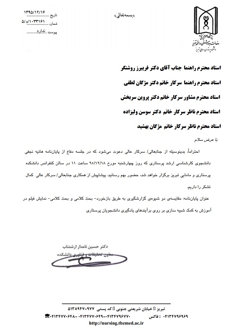 جلسه دفاع از پایاننامه خانم هانیه نجفی، دانشجوی کارشناسی ارشد پرستاری