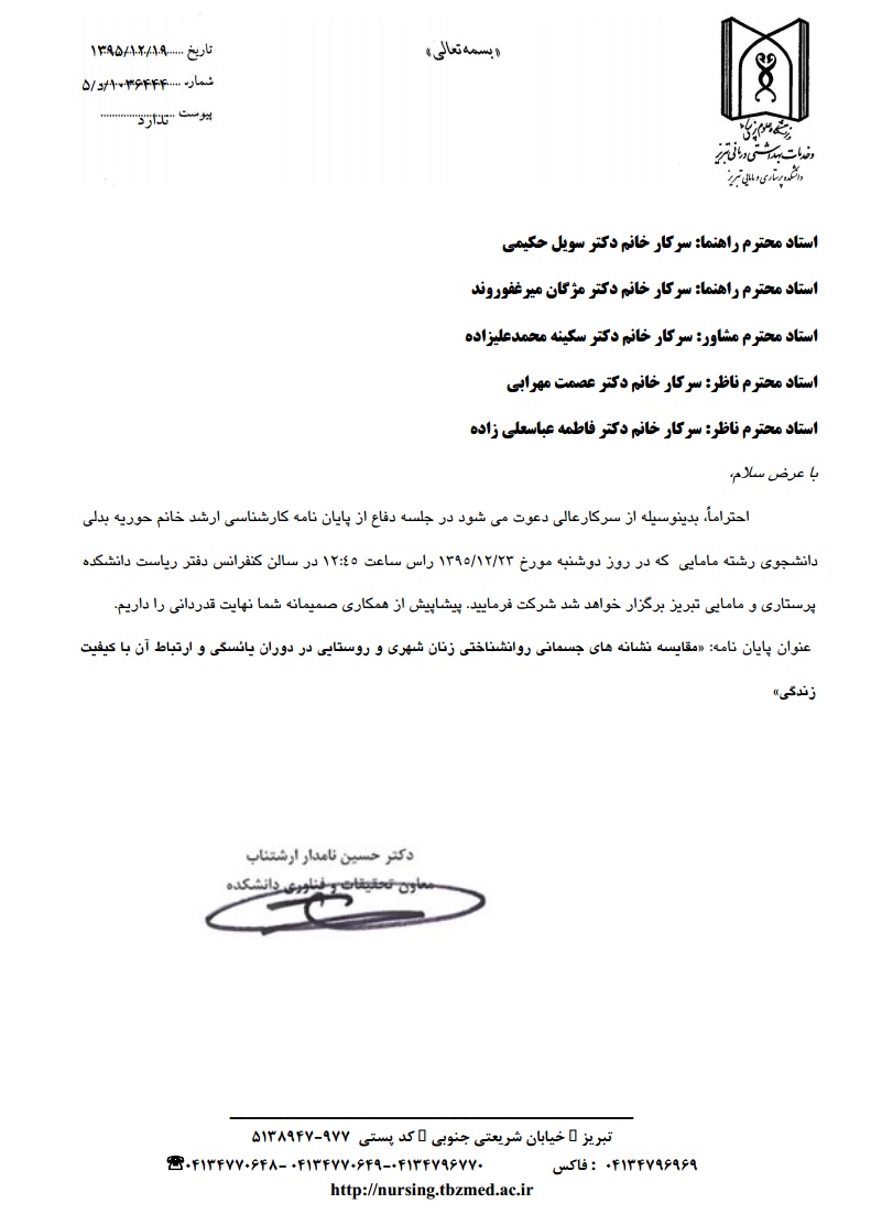 جلسه دفاع از پایاننامه خانم حوریه بدلی، دانشجوی کارشناسی ارشد مامایی