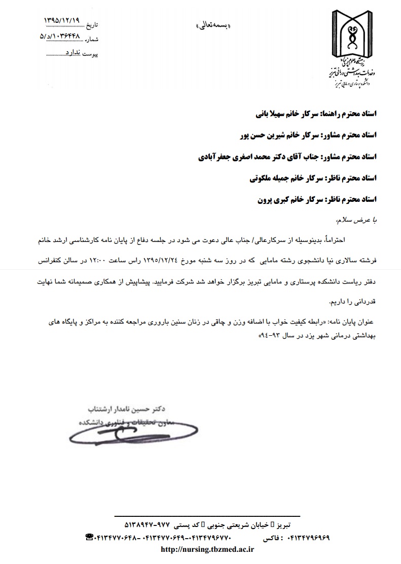 جلسه دفاع از پایاننامه خانم فرشته سالاری نیا، دانشجوی کارشناسی ارشد مامایی