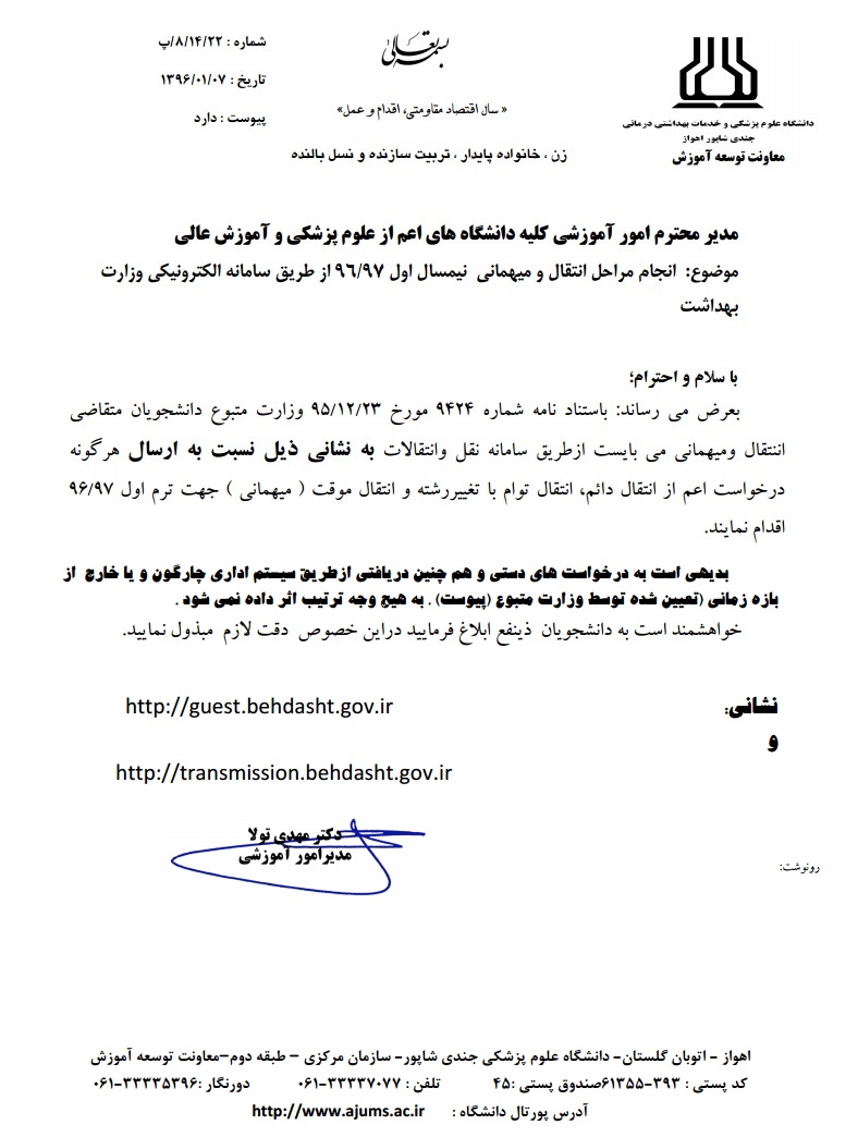 انجام مراحل انتقال و میهمانی نیمسال اول 97-96 از طریق سامانه الکترونیکی وزارت بهداشت