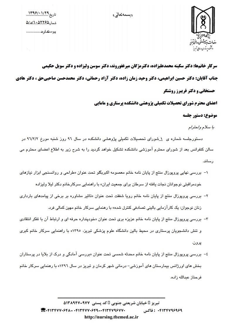 دستور جلسه اولین شورای تحصیلات تکمیلی پژوهشی دانشکده در سال 96؛ روز شنبه مورخه 2 اردیبهشت