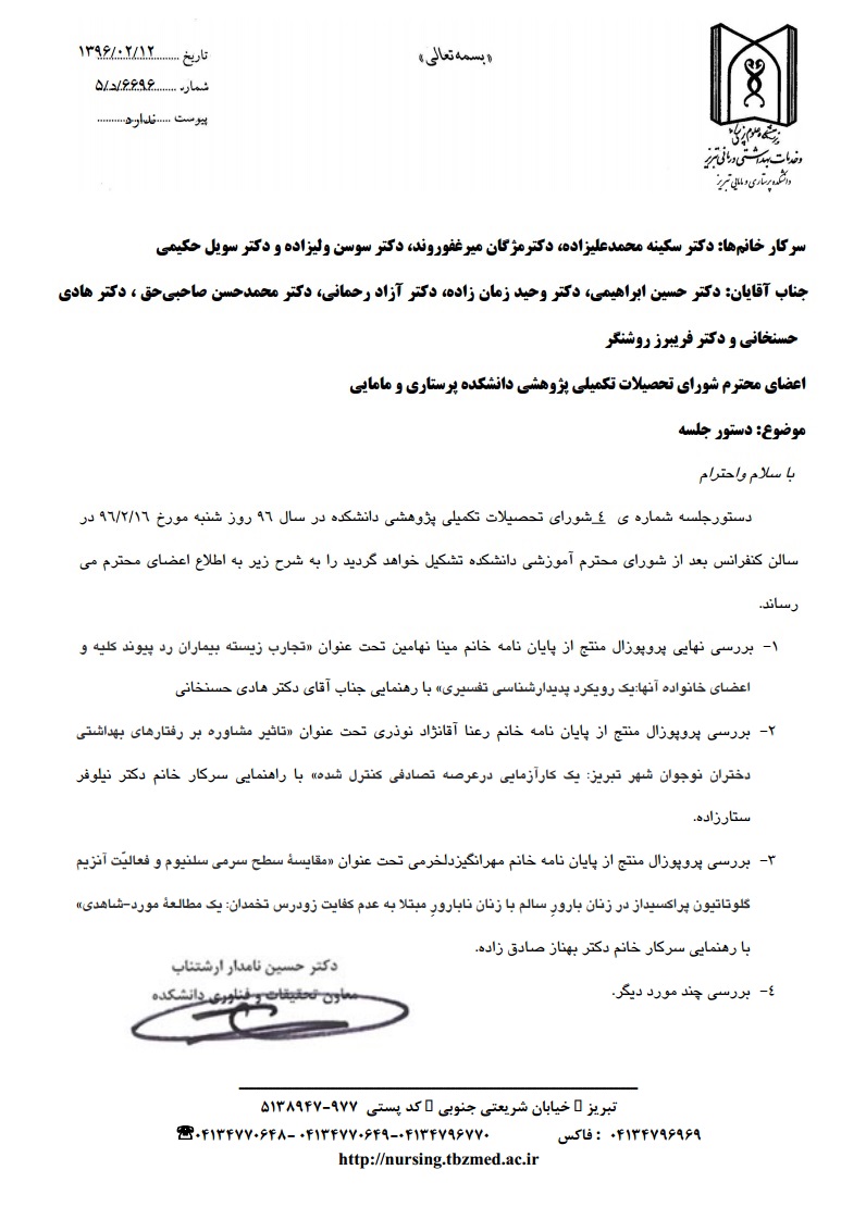 دستور جلسه چهارمین شورای تحصیلات تکمیلی پژوهشی دانشکده در سال 96؛ شنبه مورخه 16 اردیبهشت