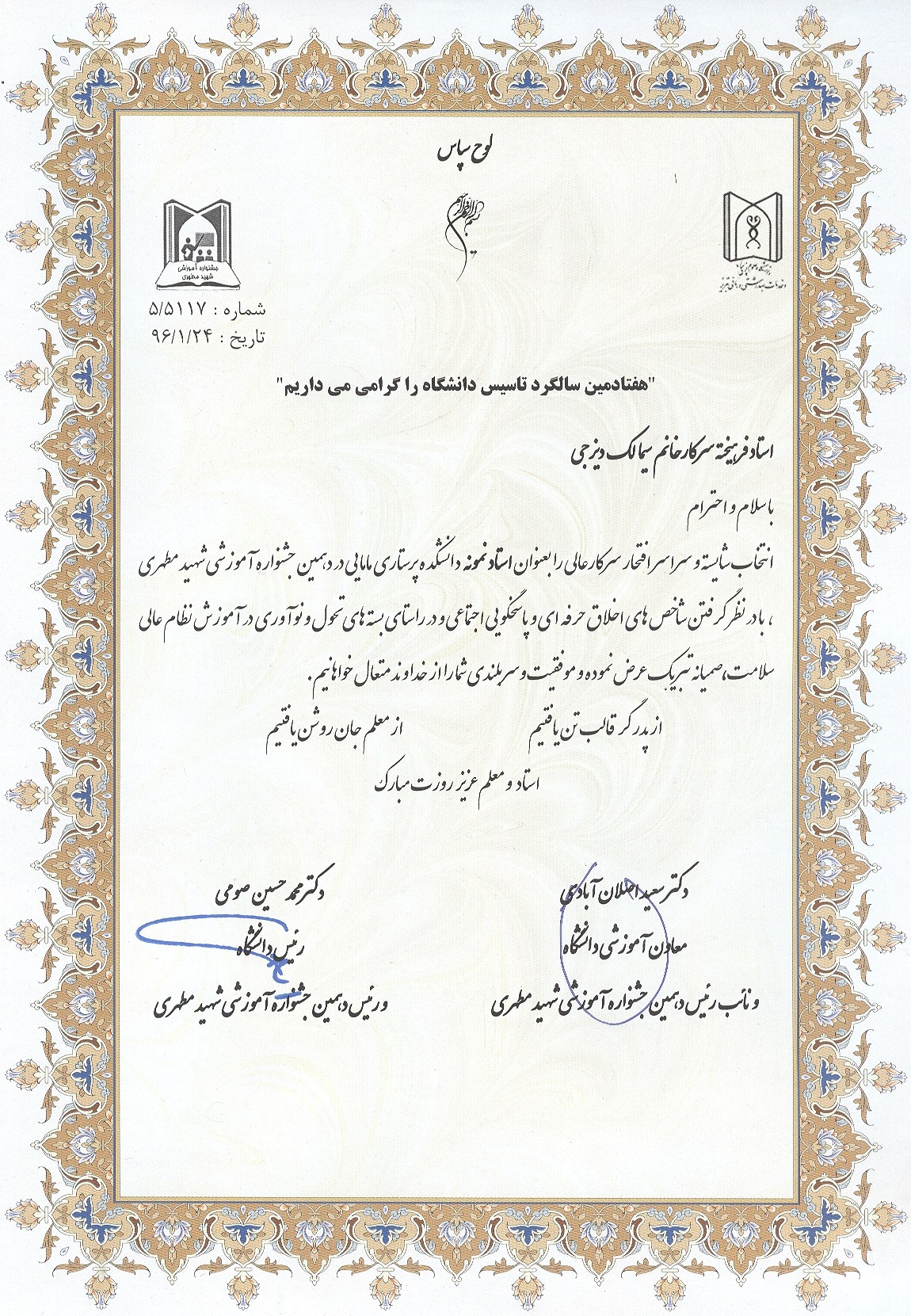 بدینوسیله انتخاب شایسته سرکار خانم سیما لک دیزجی، عضو محترم هیأت علمی گروه پرستاری داخلی جراحی دانشکده، بعنوان استاد نمونه دانشکده در دهمین جشنواره آموزشی شهید مطهری را خدمت ایشان، خانواده محترمشان و کلیه همکاران محترم دانشکده تبریک و تهنیت عرض نموده، از درگاه خداوند توفیق و موفقیت روزافزونشان را مسئلت داریم.