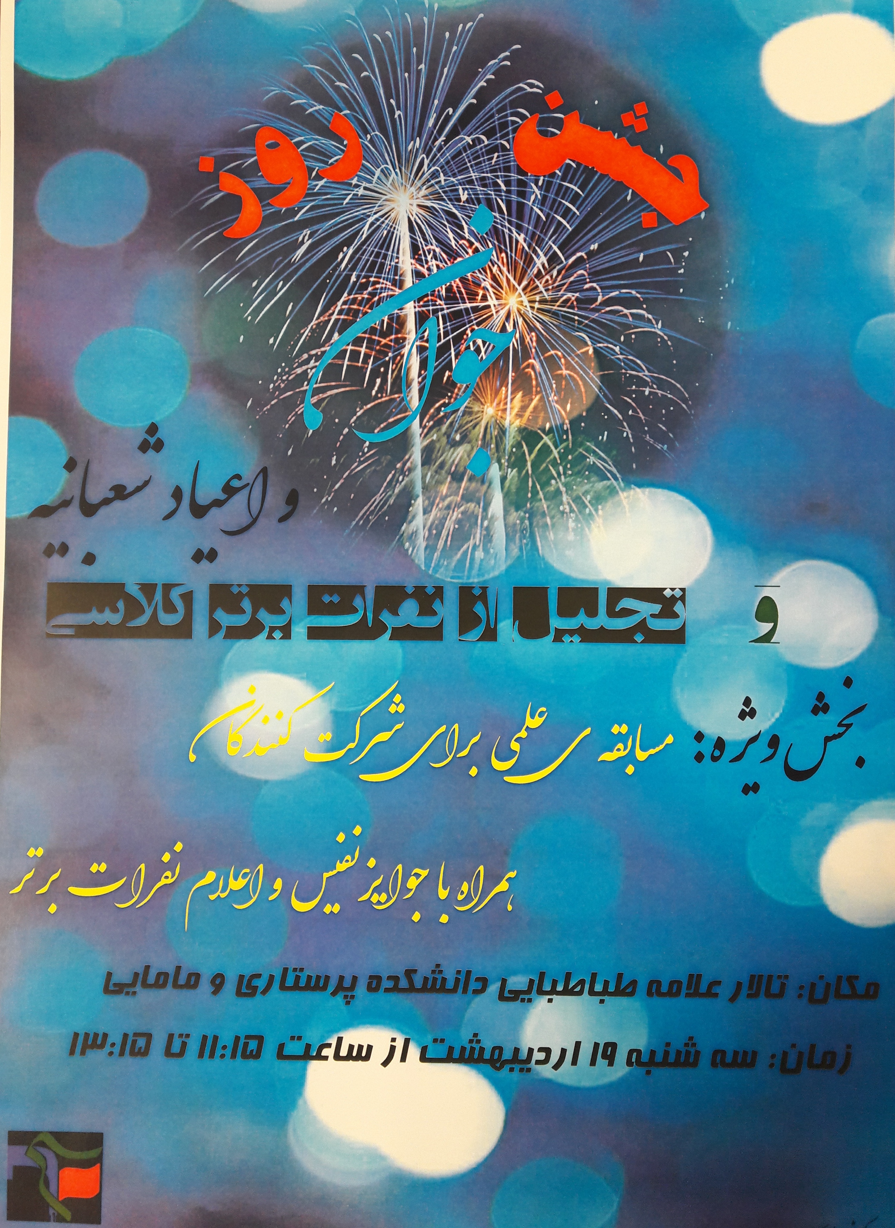 به اطلاع عموم دانشجویان عزیز و همکاران محترم می رساند جشن اعیاد شعبانیه و تجلیل از دانشجویان معدل برتر، روز سه شنبه مورخه 19 اردیبهشت از ساعت 11:15 الی 13:15 در محل تالار علامه طباطبایی دانشکده برگزار خواهد گردید. از همه عزیزان دعوت میشود در این جشن حضور بهم رسانند.
