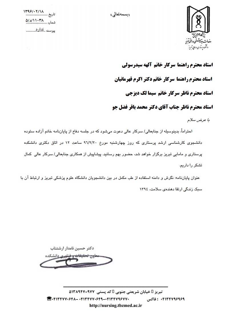 جلسه دفاع از پایاننامه خانم آزاده ستوده، دانشجوی کارشناسی ارشد پرستاری