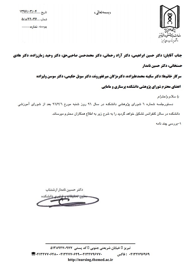 دستور جلسه ششمین شورای تحصیلات تکمیلی پژوهشی دانشکده در سال 96؛ شنبه مورخه 6 خرداد