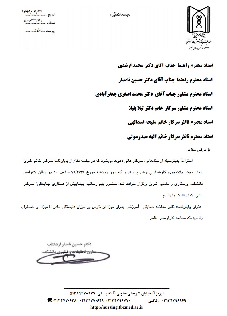 جلسه دفاع از پایاننامه خانم کبری روانبخش، دانشجوی کارشناسی ارشد پرستاری