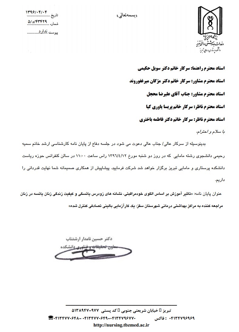 جلسه دفاع از پایاننامه خانم سمیه رحیمی، دانشجوی کارشناسی ارشد مامایی