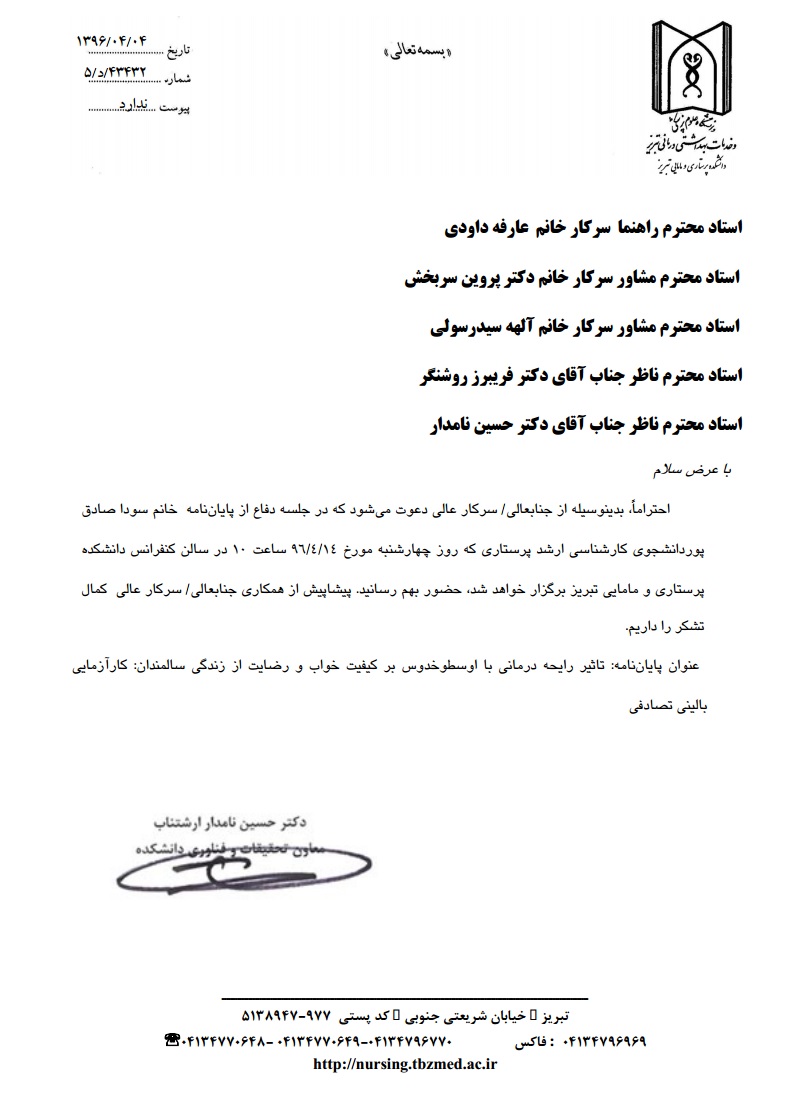 جلسه دفاع از پایاننامه خانم سودا صادق پور، دانشجوی کارشناسی ارشد پرستاری
